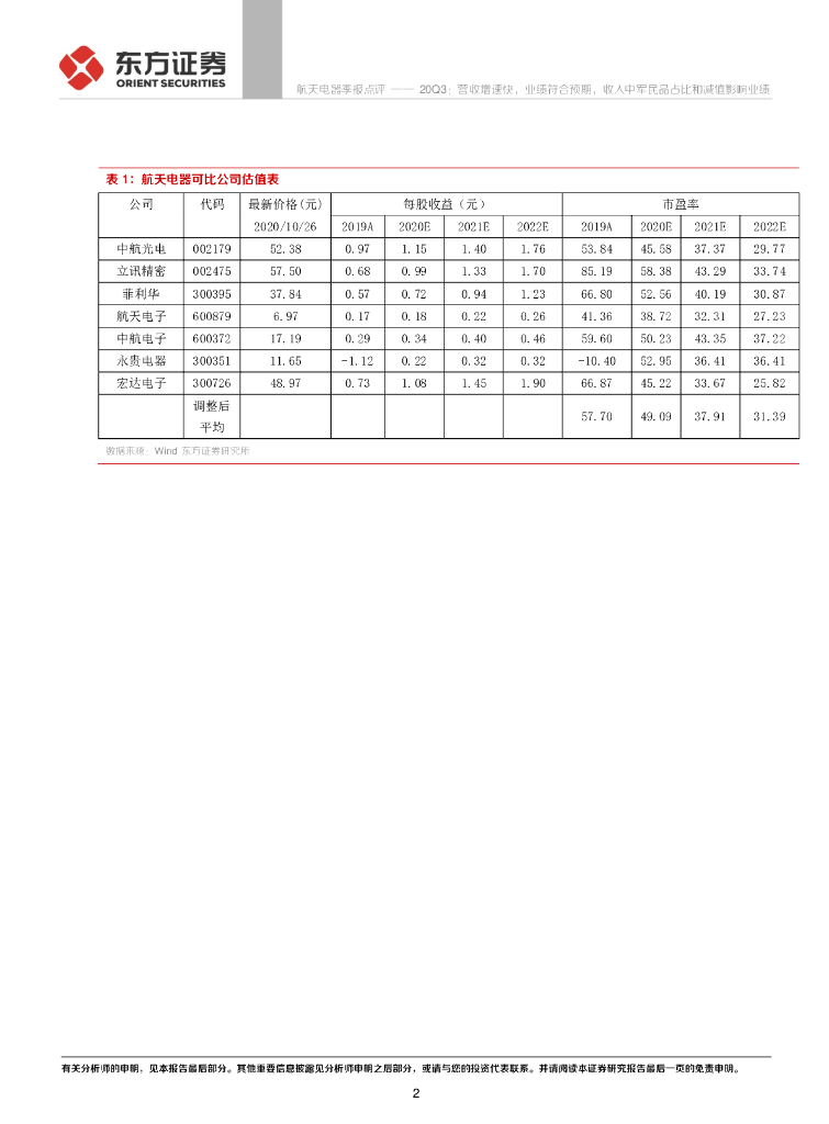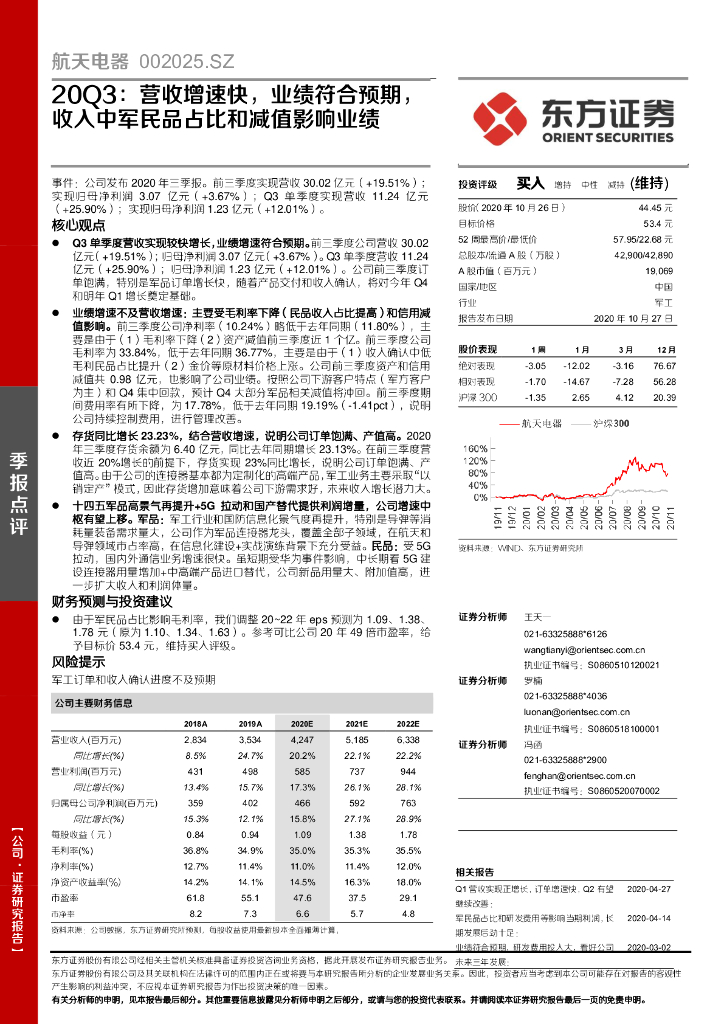东方证券:航天电器(002025)-20Q3:营收增速快,业绩符合预期,收入中军民品占比和减值影响业绩.pdf