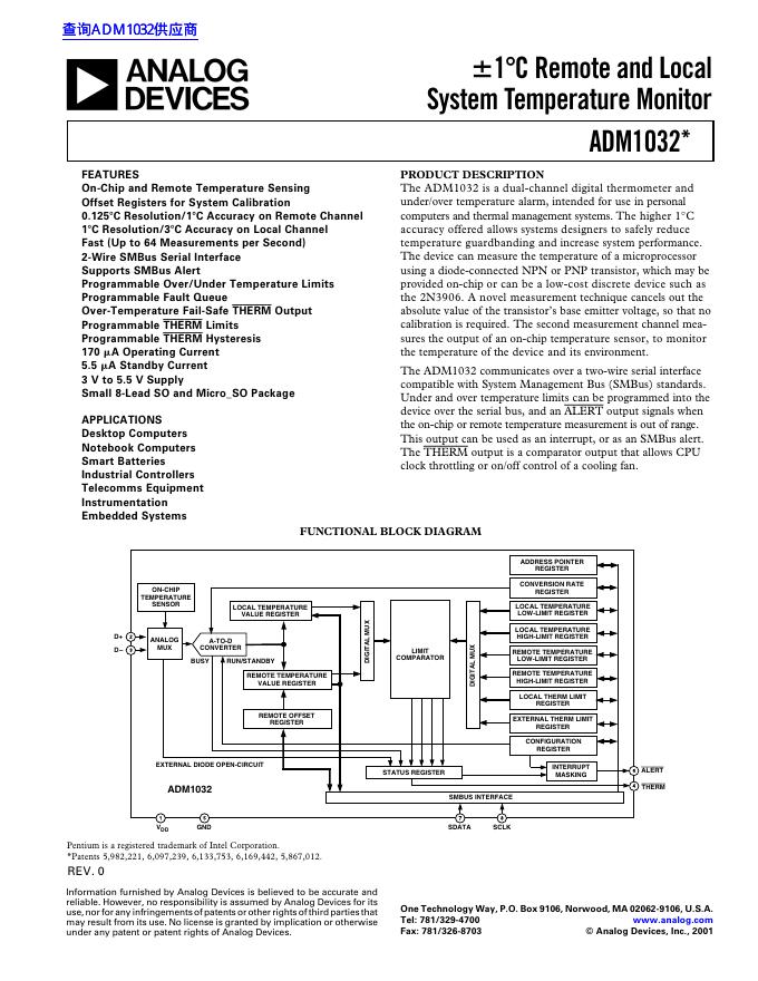 ANALOG DEVICES ADM1032* ±1℃remote and local system temperature monitor 数据手册.pdf