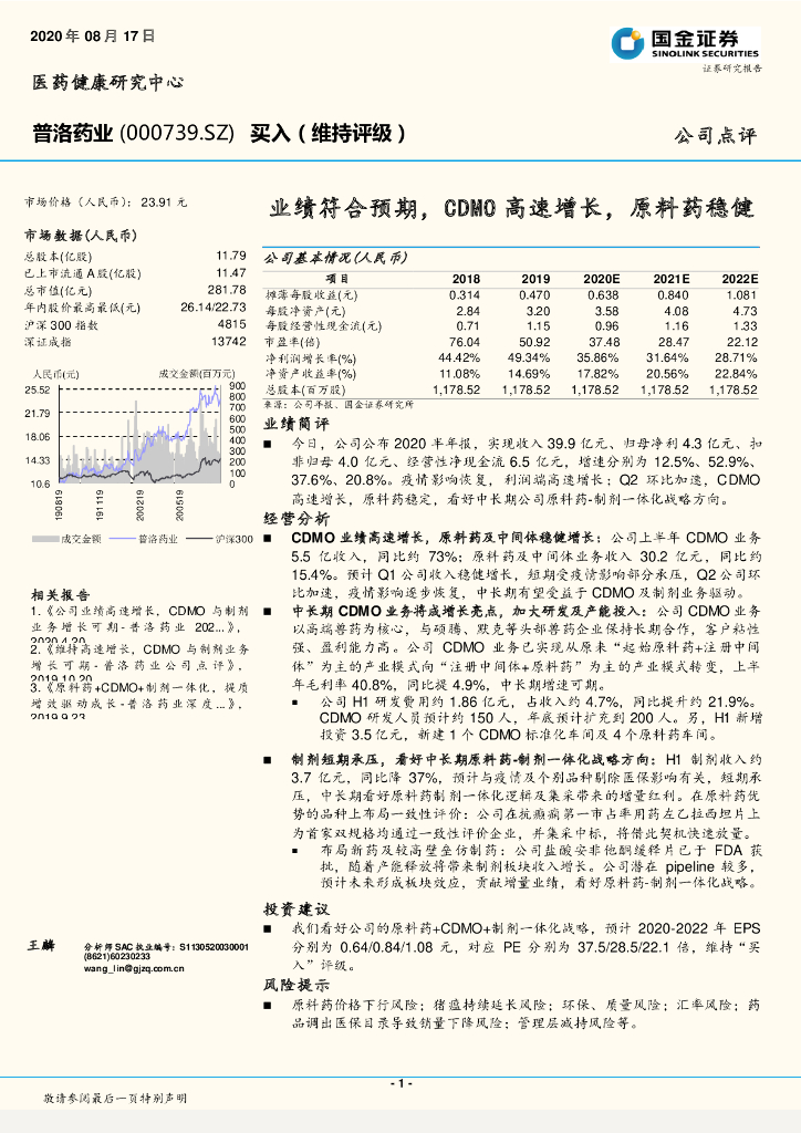 国金证券:普洛药业(000739)-业绩符合预期,CDMO高速增长,原料药稳健.pdf