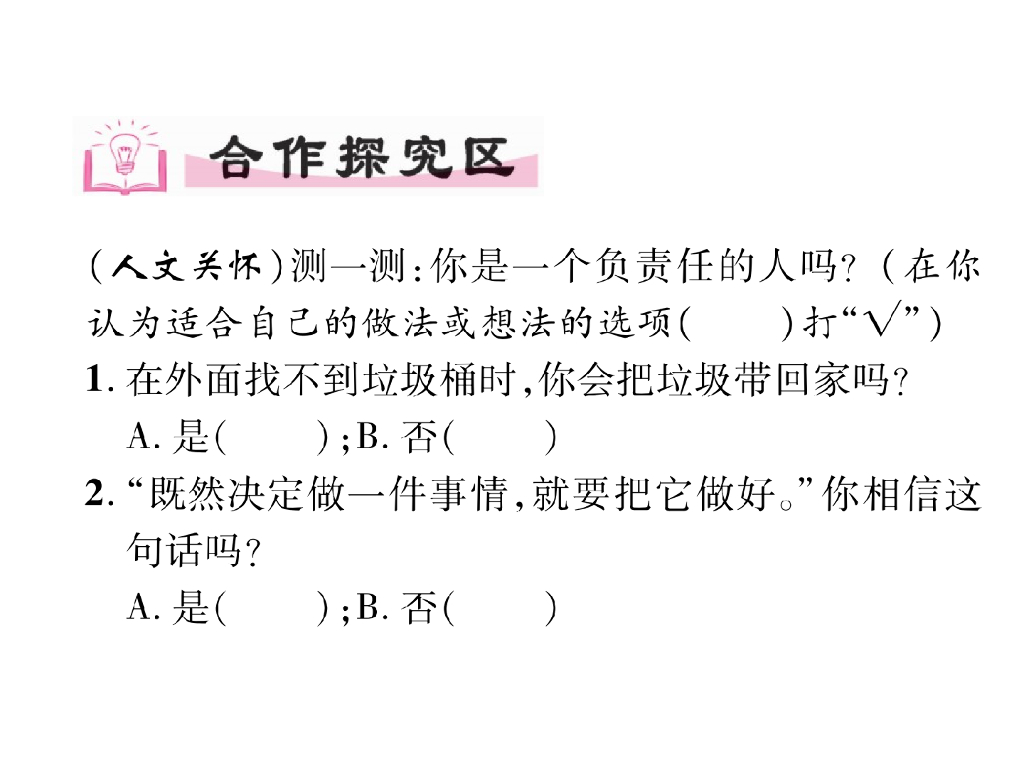 八年级道德与法治上册同步作业课件:第六课 责任与角色同在 第2课时 做负责任的人 (23张).ppt