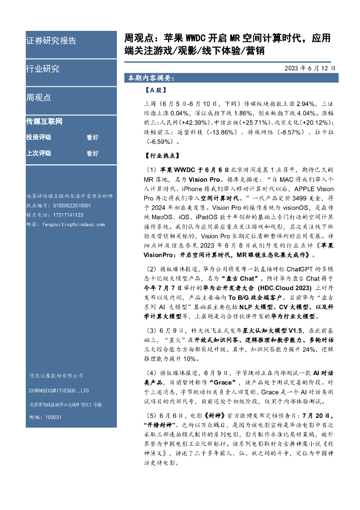 信达证券:传媒互联网及海外周观点:苹果WWDC开启MR空间计算时代,应用端关注游戏/观影/线下体验/营销.pdf