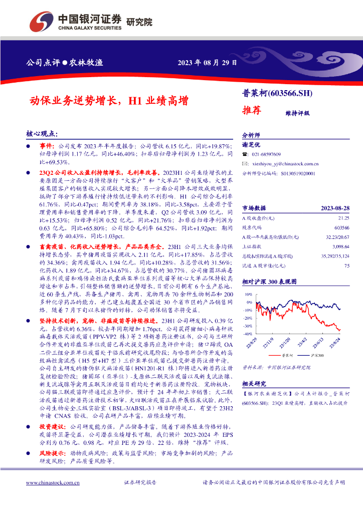 中国银河:普莱柯(603566)-动保业务逆势增长,H1业绩高增.pdf