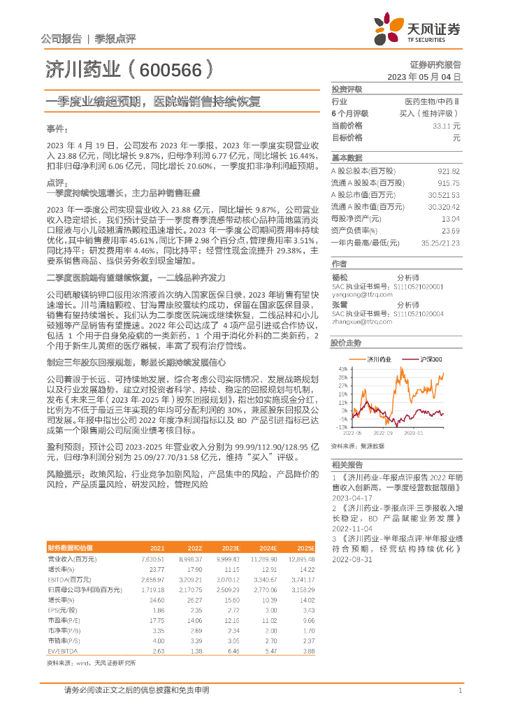 天风证券:济川药业(600566)-一季度业绩超预期,医院端销售持续恢复.pdf