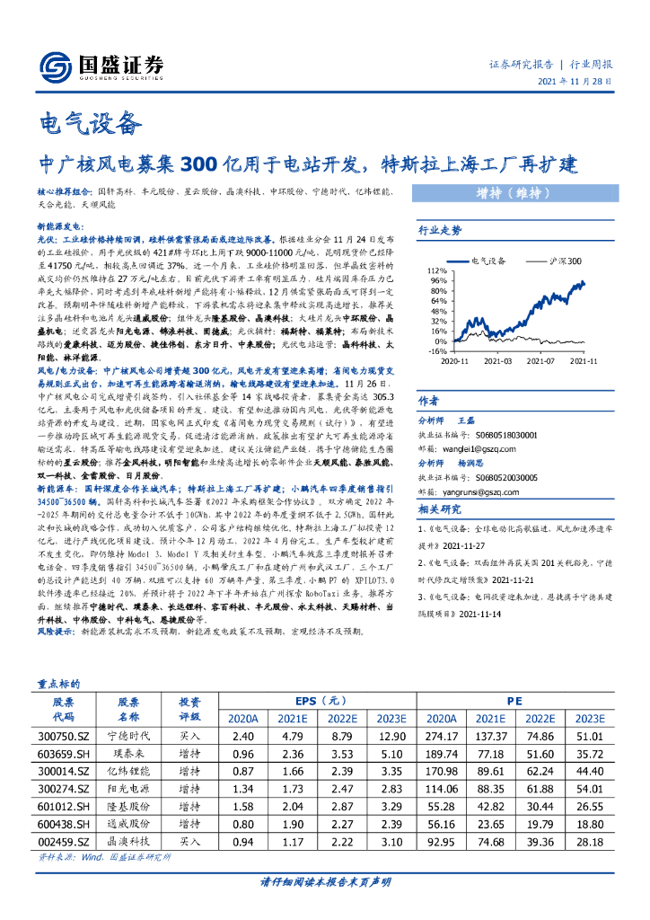 国盛证券:电气设备行业周报:中广核风电募集300亿用于电站开发,特斯拉上海工厂再扩建.pdf