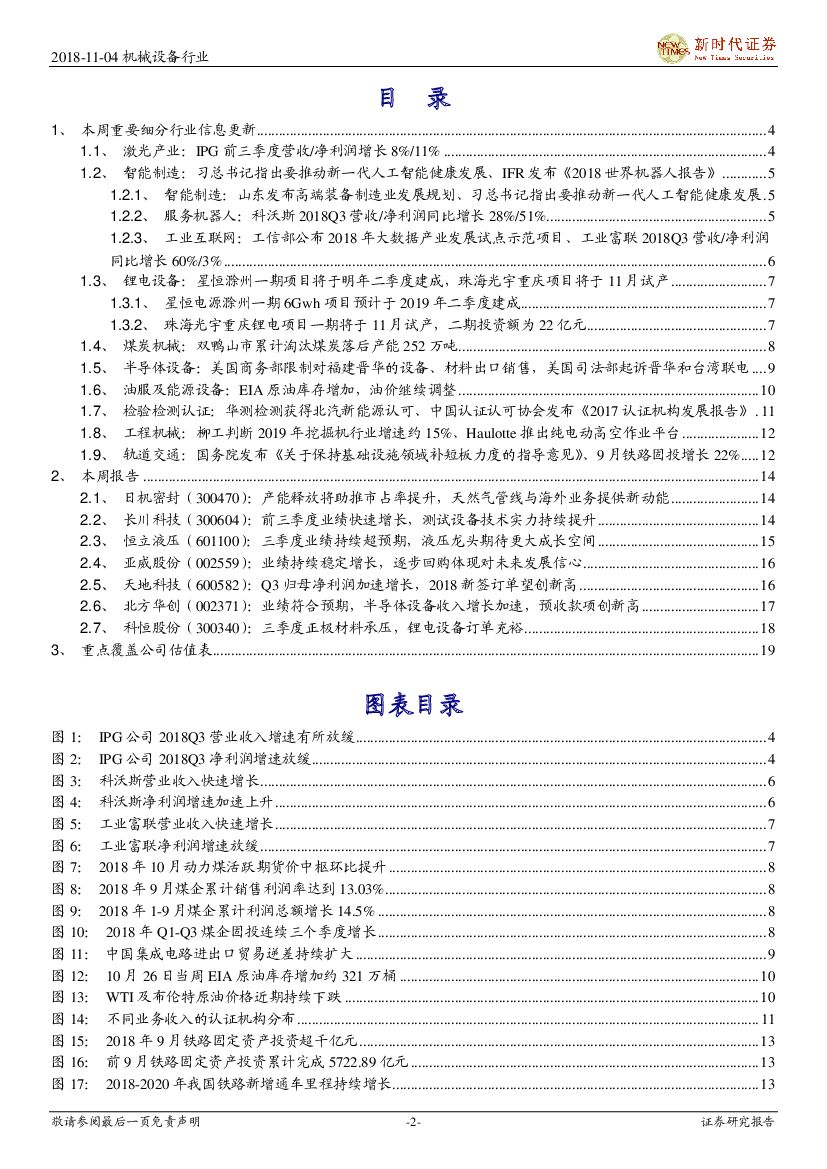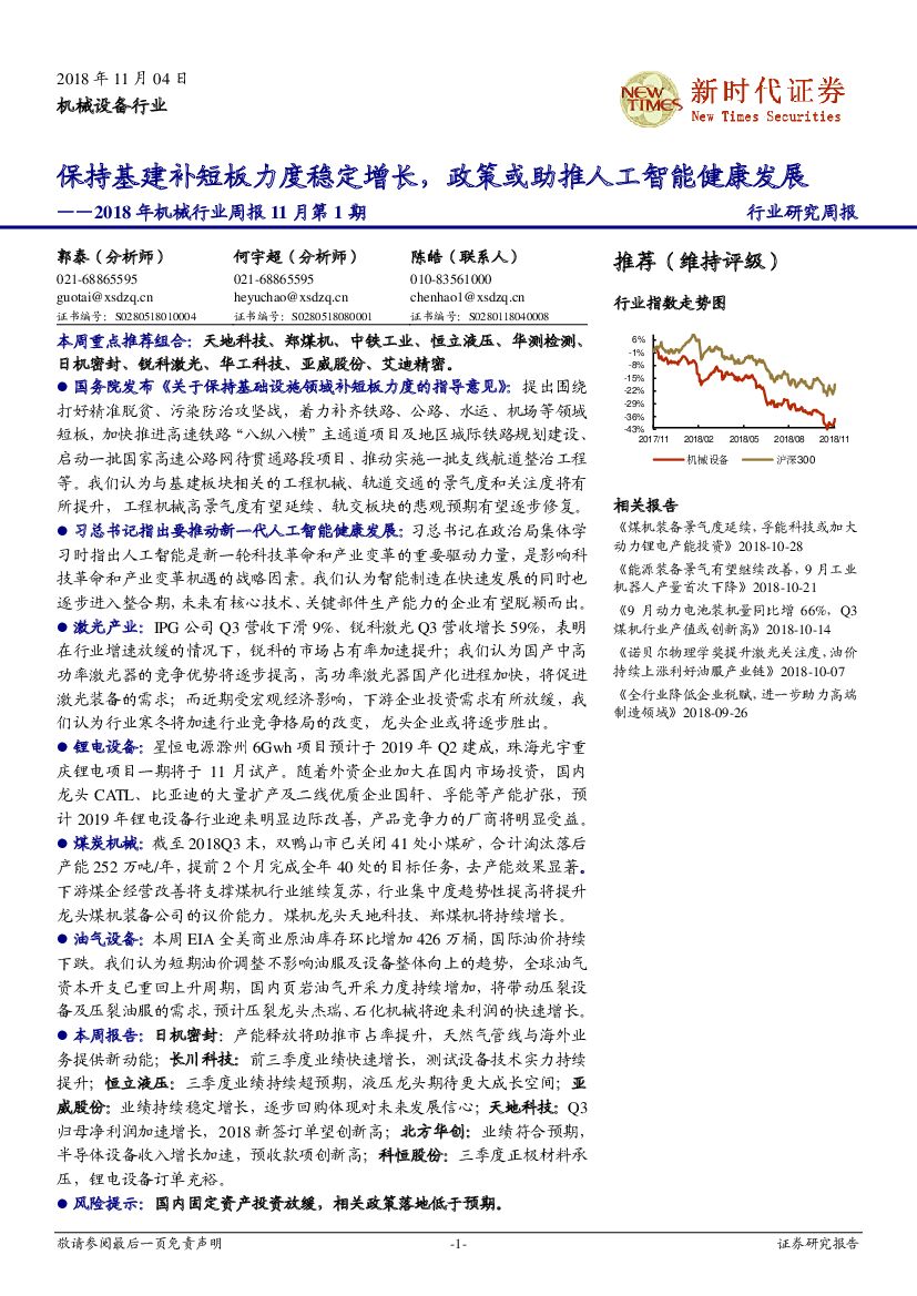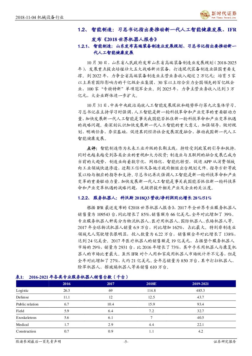 新时代证券:2018年机械行业周报11月第1期:保持基建补短板力度稳定增长,政策或助推人工智能健康发展.pdf