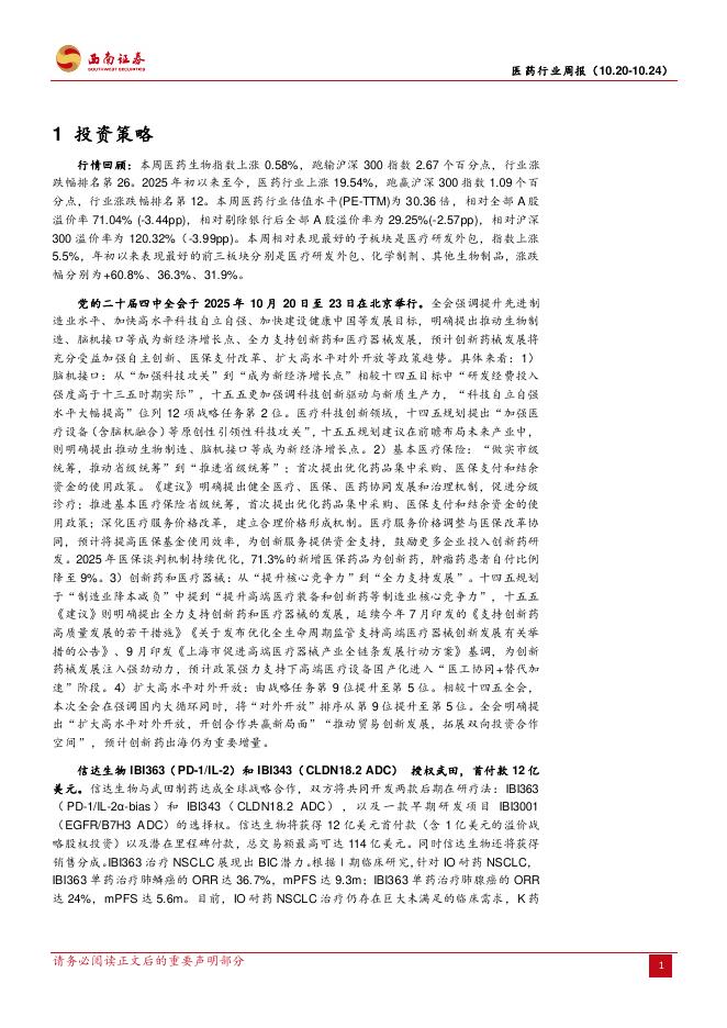 西南证券:医药行业周报:二十届四中全会明确推进健康中国,十五五规划建议明确支持创新药械发展.pdf