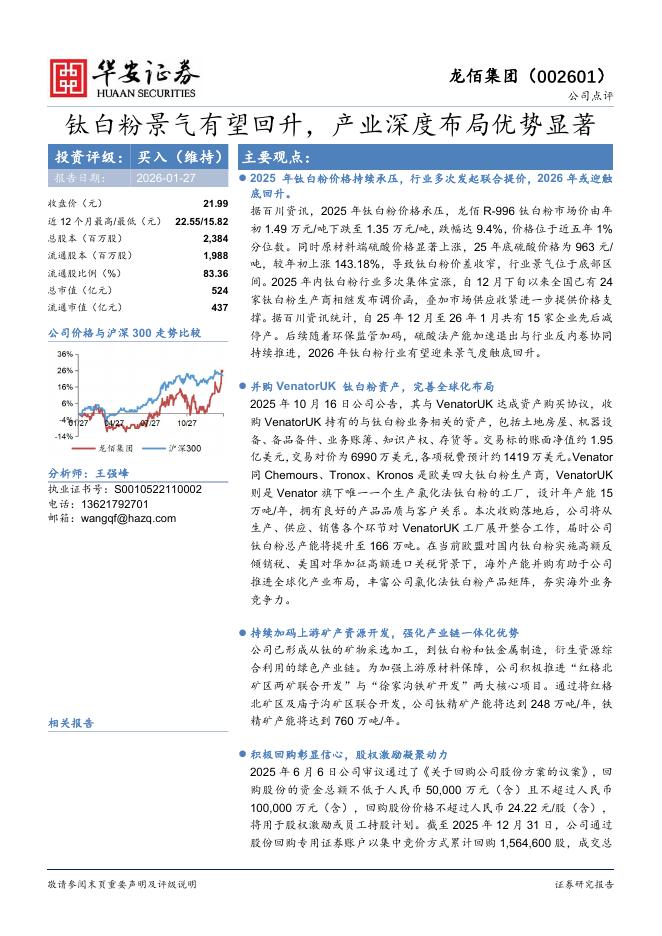 华安证券:龙佰集团(002601)-钛白粉景气有望回升,产业深度布局优势显著.pdf