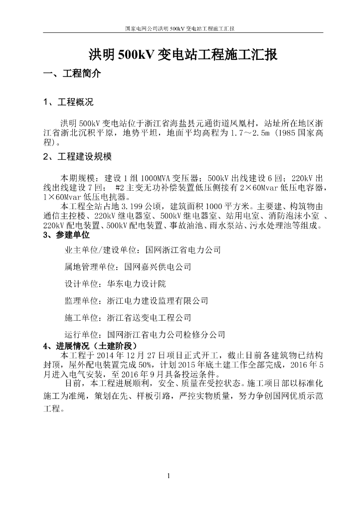 洪明500千伏变电站施工项目部汇报材料.doc