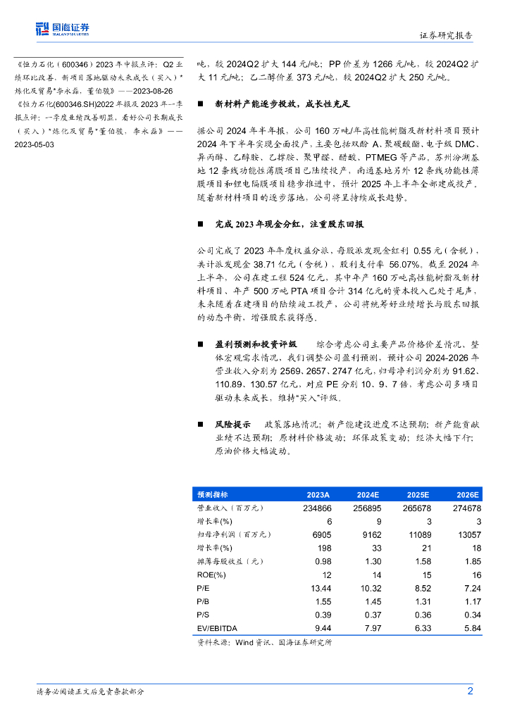 国海证券:恒力石化(600346)-2024年中报点评:经营业绩稳健,高性能树脂及新材料项目逐步投产.pdf