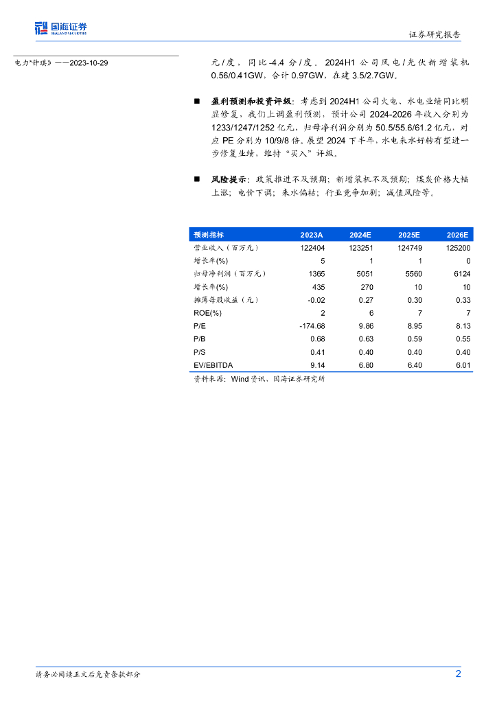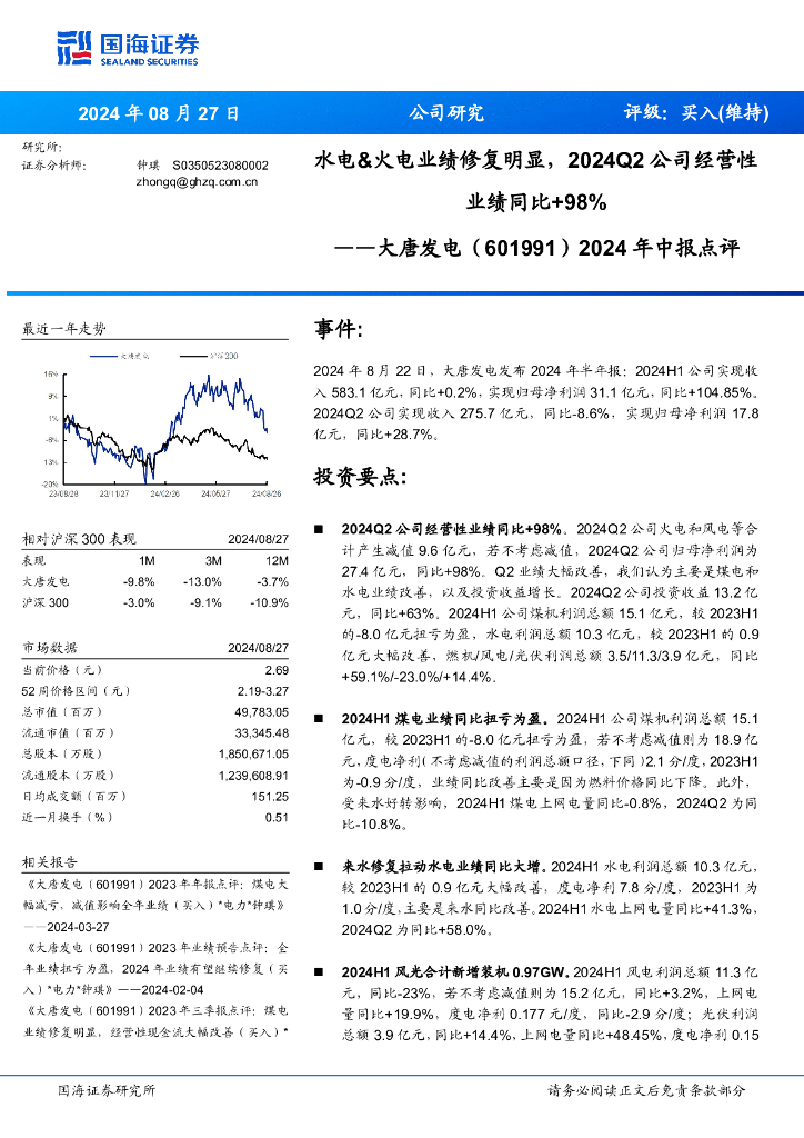 国海证券:大唐发电(601991)-2024年中报点评:水电&火电业绩修复明显,2024Q2公司经营性业绩同比+98%.pdf