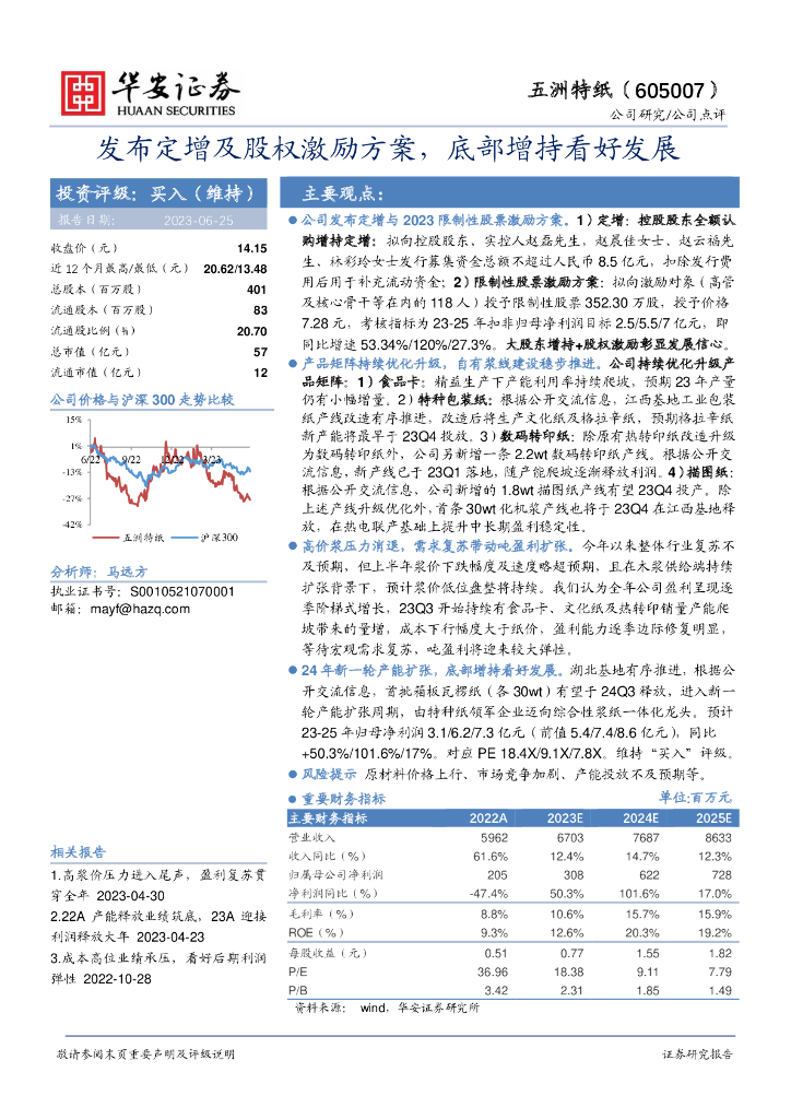 华安证券:五洲特纸(605007)-发布定增及股权激励方案,底部增持看好发展.pdf