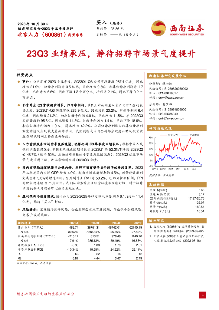 西南证券:北京人力(600861)-2023年三季报点评:23Q3业绩承压,静待招聘市场景气度提升.pdf