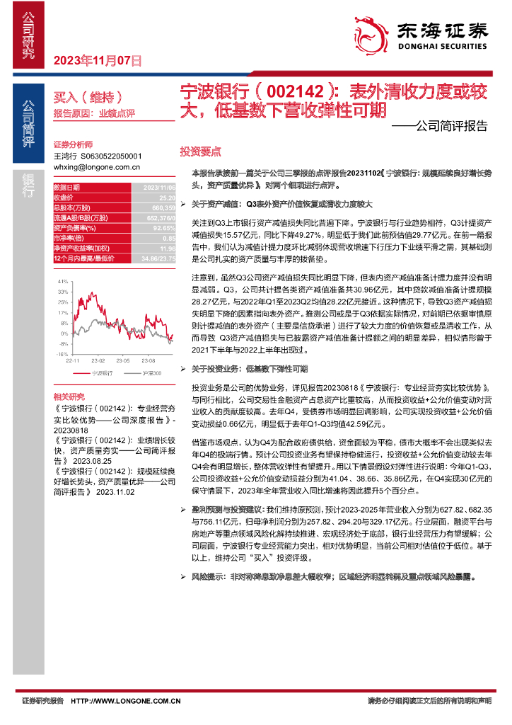 东海证券:宁波银行(002142)-公司简评报告:表外清收力度或较大,低基数下营收弹性可期.pdf