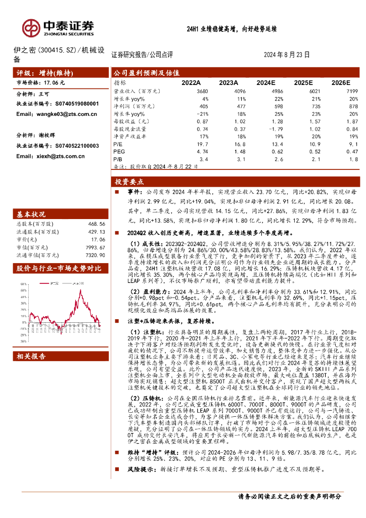 中泰证券:伊之密(300415)-24H1业绩稳健高增,向好趋势延续.pdf
