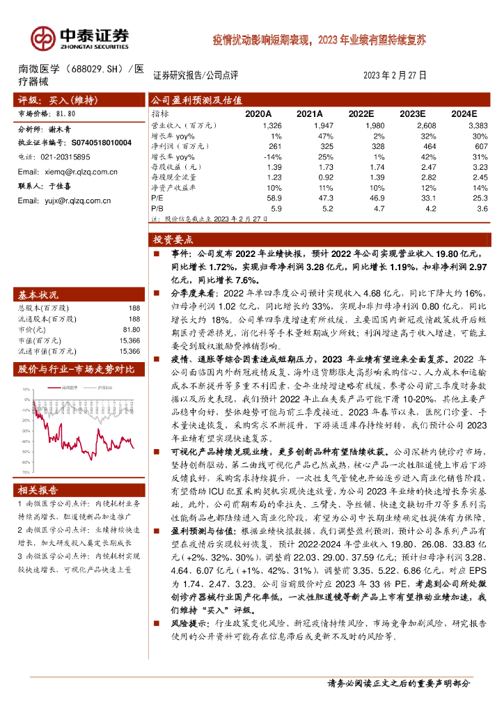 中泰证券:南微医学(688029)-疫情扰动影响短期表现,2023年业绩有望持续复苏.pdf