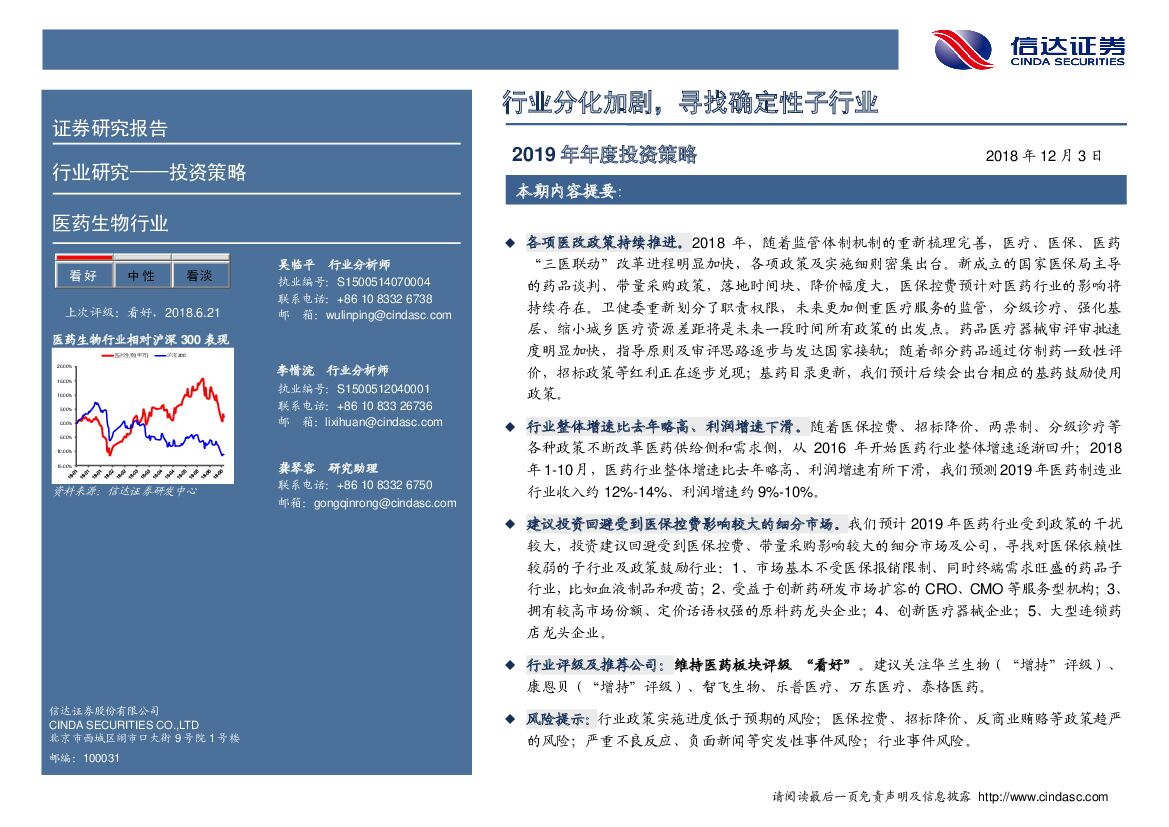 信达证券:医药生物行业2019年投资策略:行业分化加剧,寻找确定性子行业.pdf