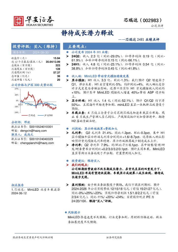 华安证券:芯瑞达24H1业绩点评:静待成长潜力释放.pdf