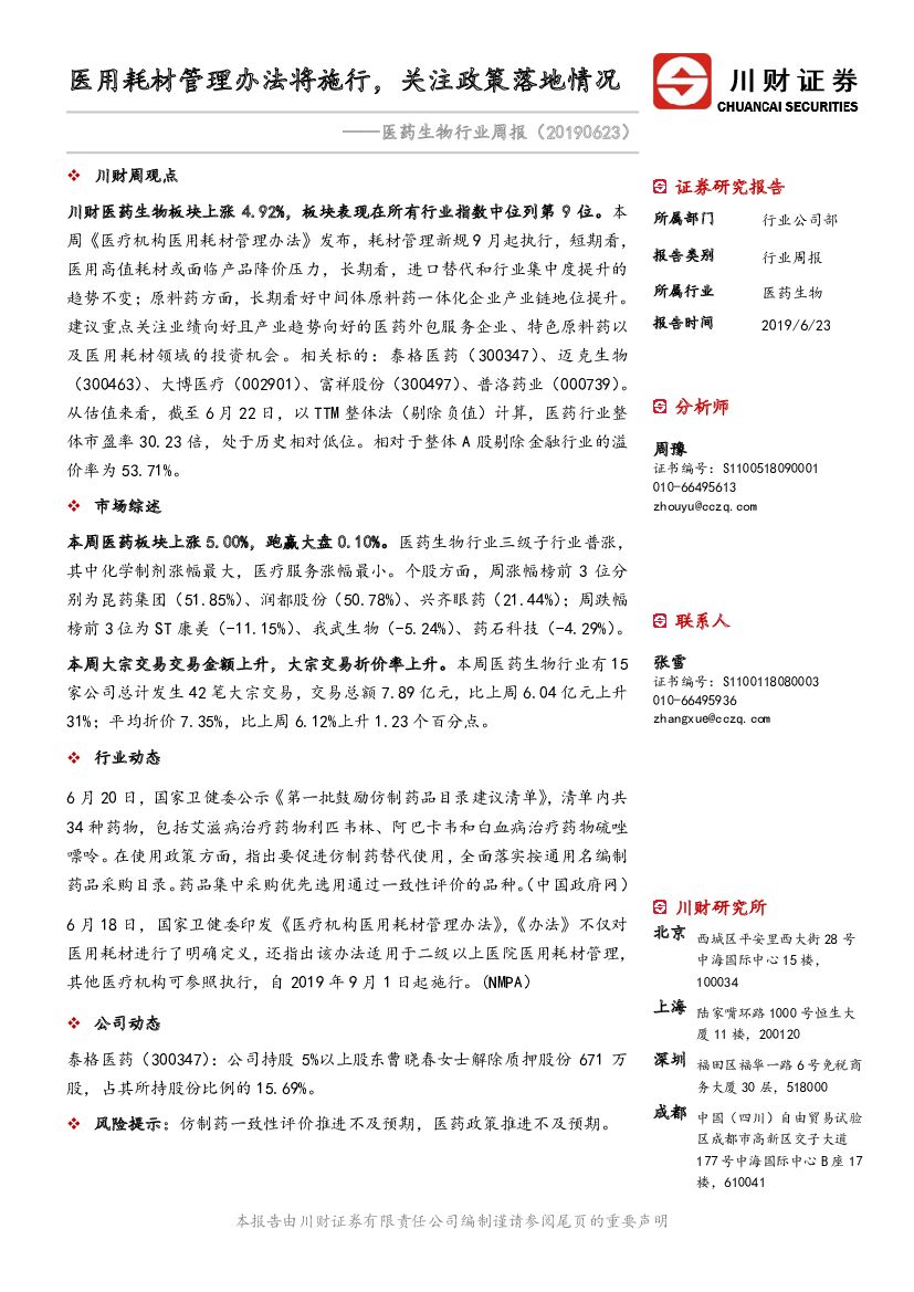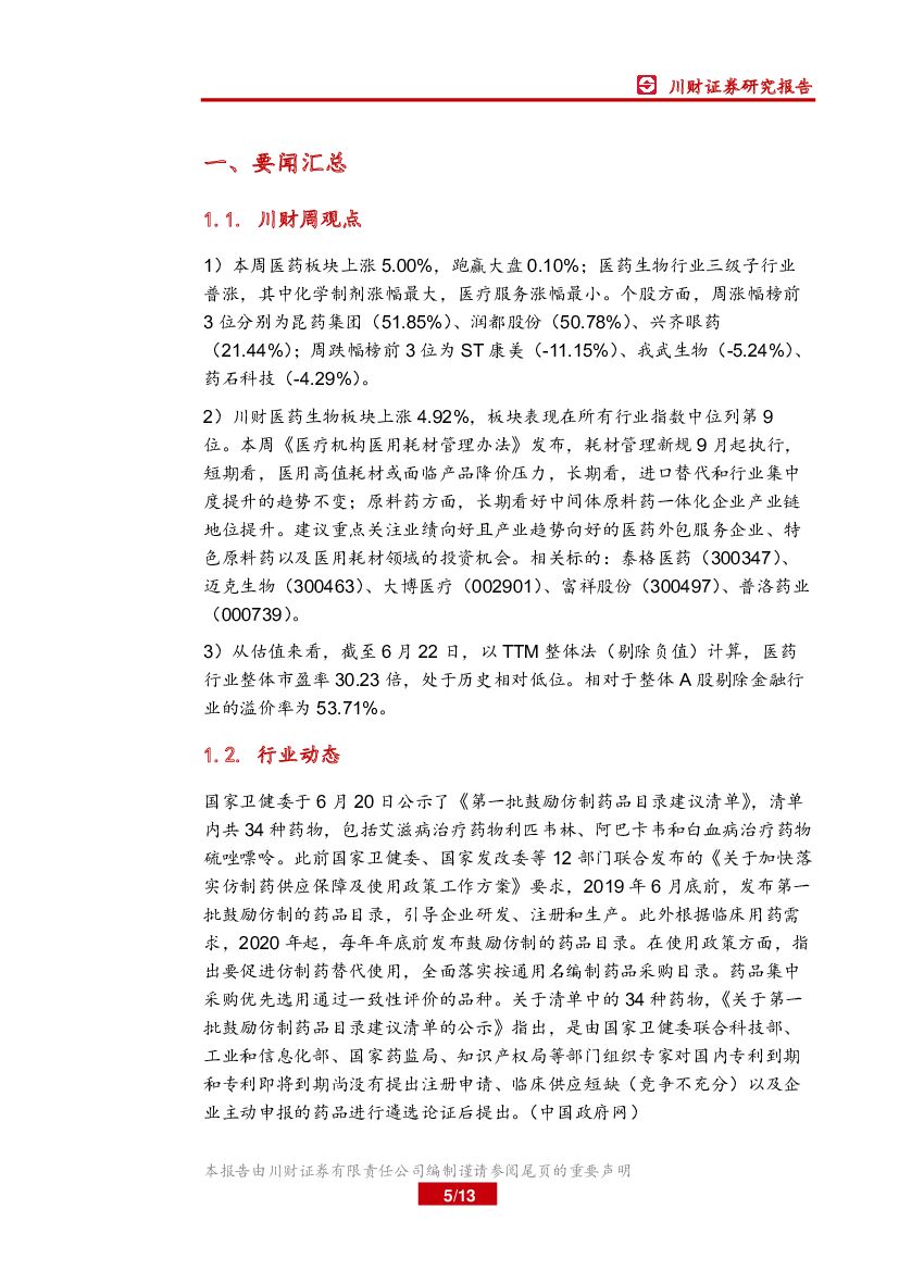 川财证券:医药生物行业周报:医用耗材管理办法将施行,关注政策落地情况.pdf