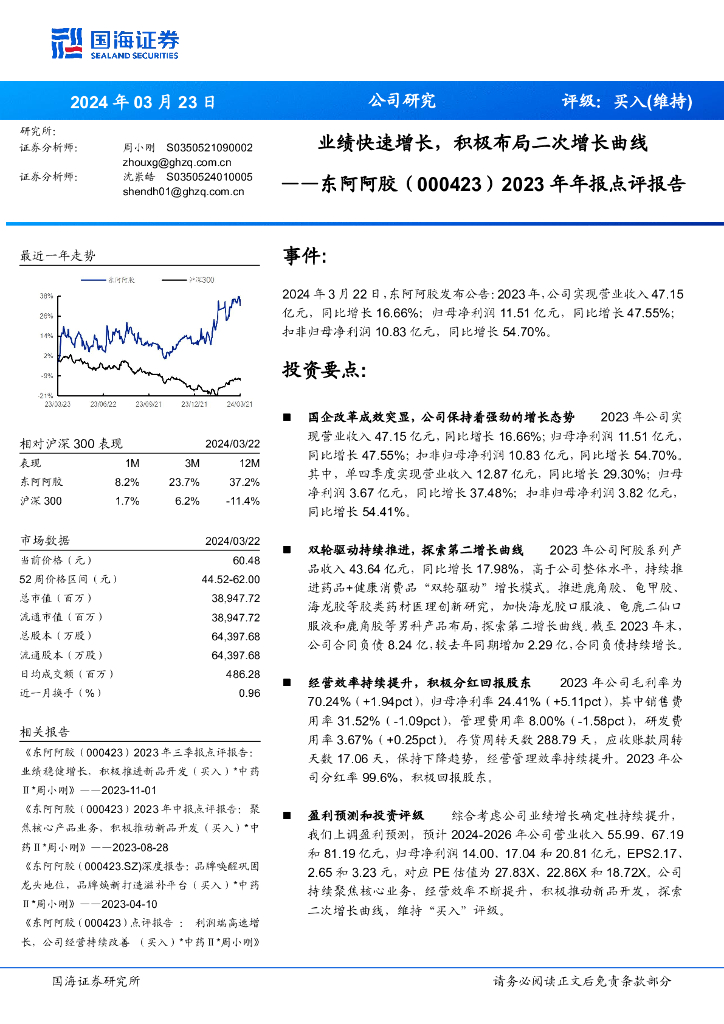 国海证券:东阿阿胶(000423)-2023年年报点评报告:业绩快速增长,积极布局二次增长曲线.pdf