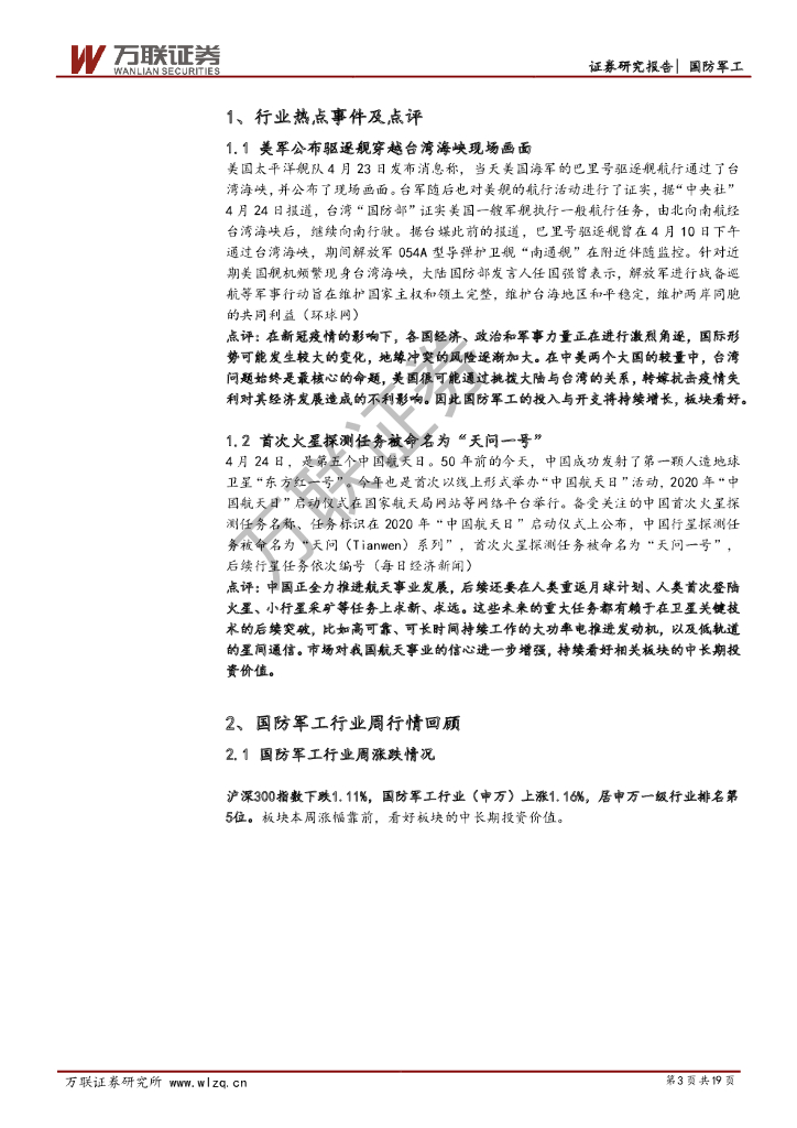 万联证券:国防军工行业周观点:板块持续增长潜力大,卫星互联网商用价值有望提升.pdf