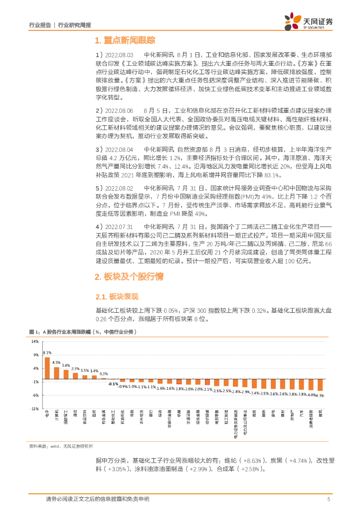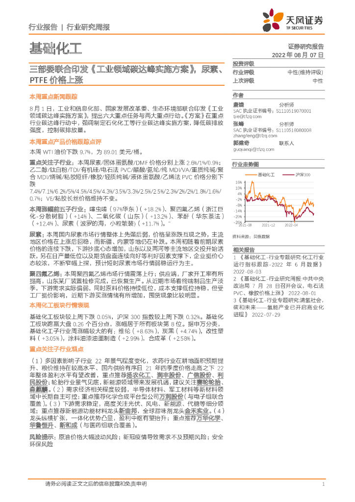 天风证券:基础化工:三部委联合印发《工业领域碳达峰实施方案》,尿素、PTFE价格上涨.pdf