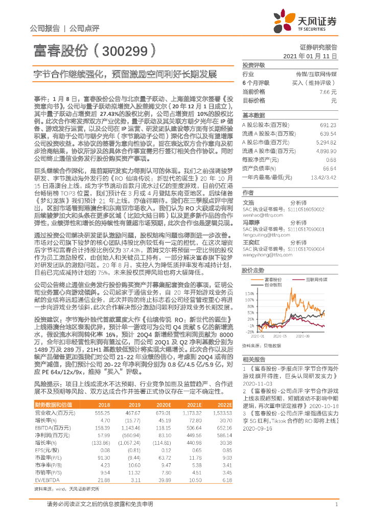 天风证券:富春股份(300299)-字节合作继续强化,预留激励空间利好长期发展.pdf