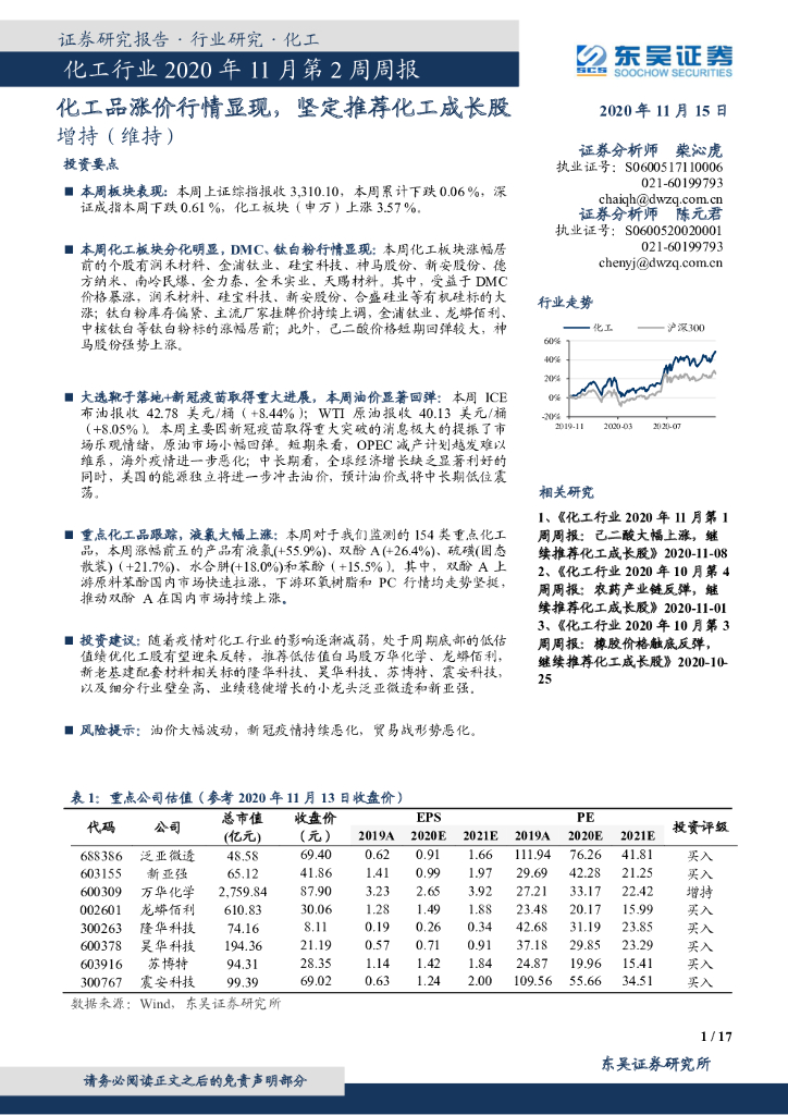 东吴证券:化工行业2020年11月第2周周报:化工品涨价行情显现,坚定推荐化工成长股.pdf