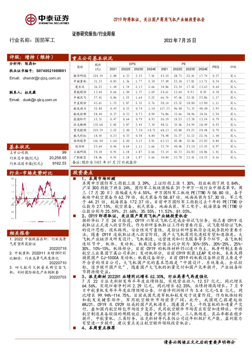 中泰证券:国防军工行业周报:C919即将取证,关注国产商用飞机产业链投资机会.pdf