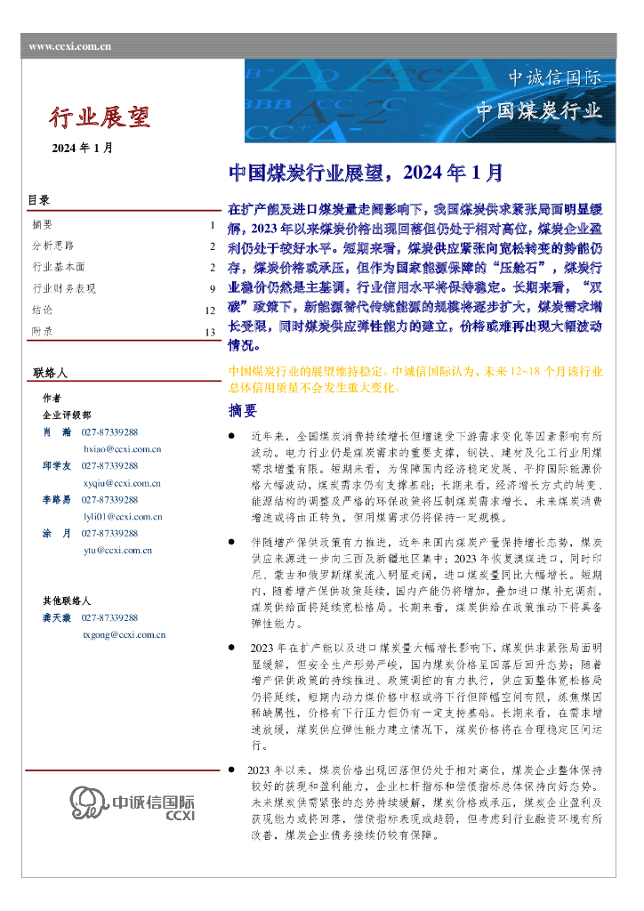 中诚信国际:中国煤炭行业展望,2024年1月.pdf