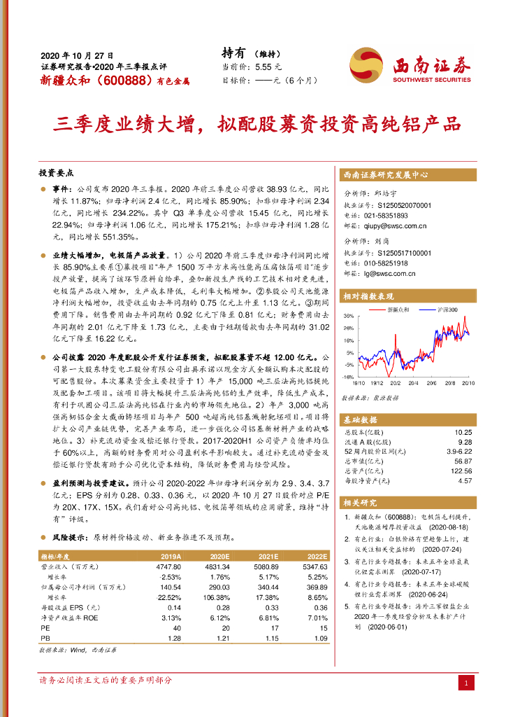 西南证券:新疆众和(600888)-2020年三季报点评:三季度业绩大增,拟配股募资投资高纯铝产品.pdf