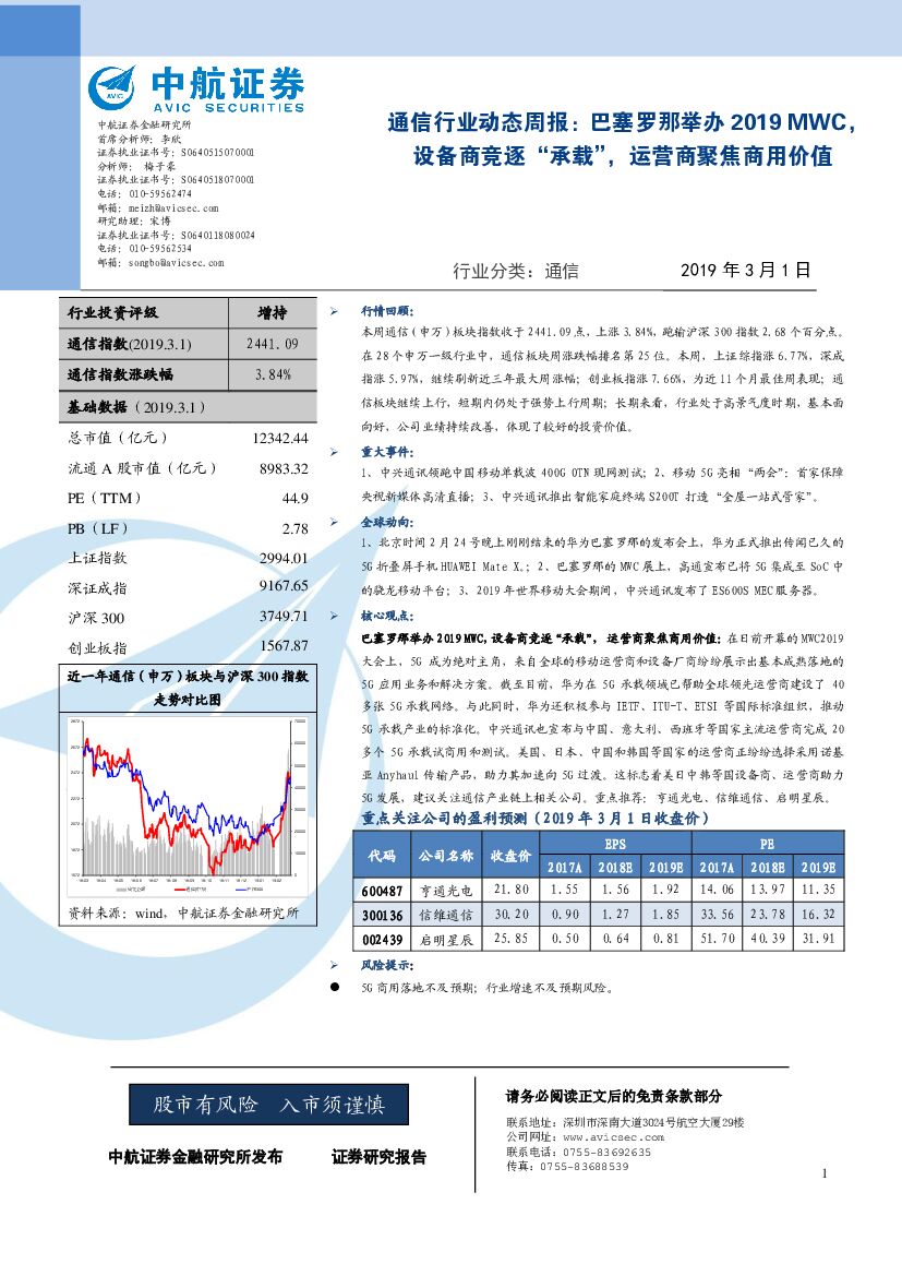 中航证券:通信行业动态周报:巴塞罗那举办2019MWC,设备商竞逐“承载”,运营商聚焦商用价值.pdf