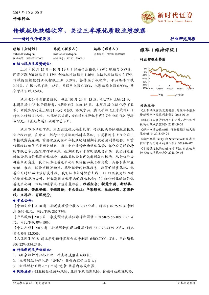 新时代证券:新时代传媒周报:传媒板块跌幅收窄,关注三季报优质股业绩披露.pdf