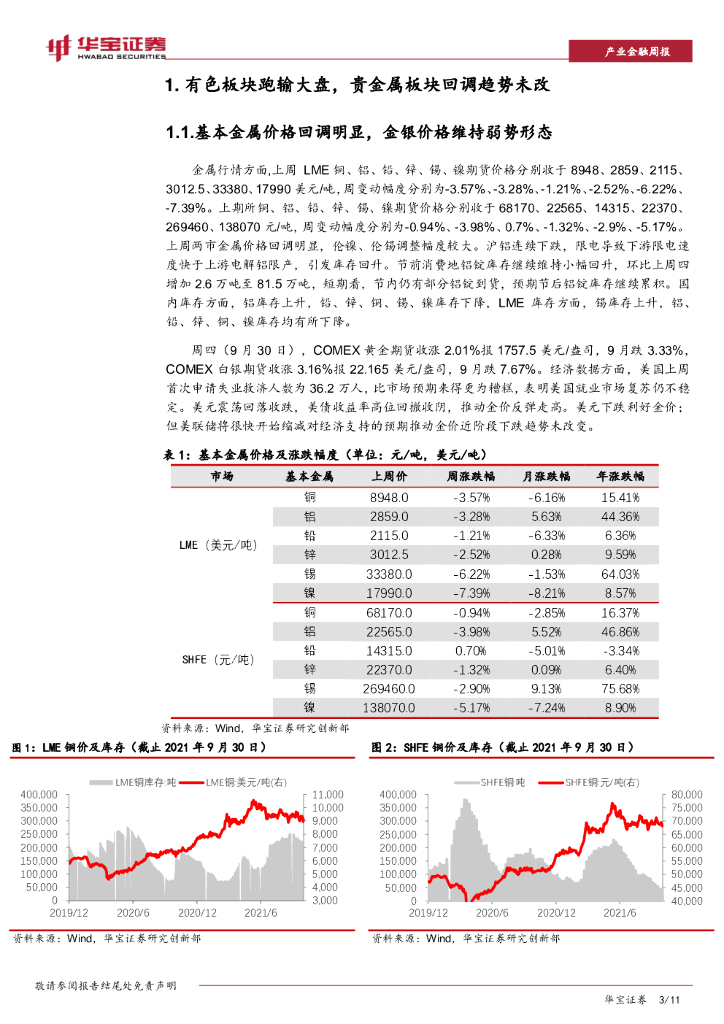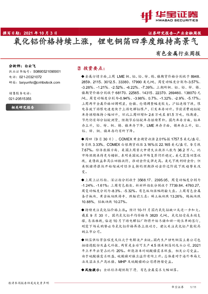 华宝证券:有色金属行业周报:氧化铝价格持续上涨,锂电铜箔四季度维持高景气.pdf