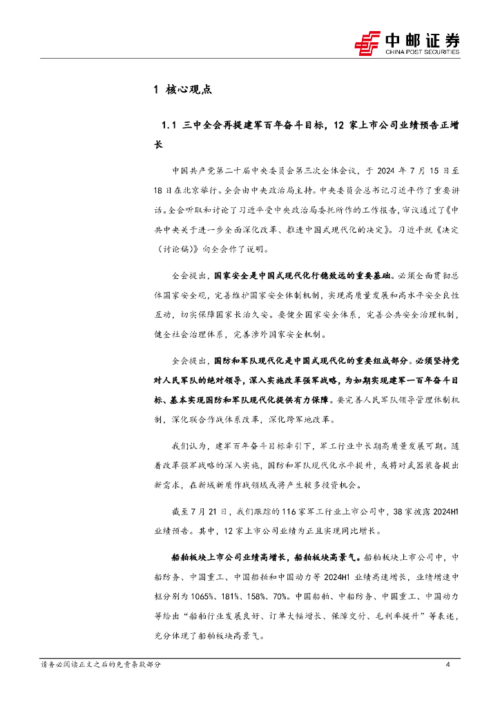 中邮证券:国防军工行业报告:三中全会再提建军百年奋斗目标,12家上市公司业绩预告正增长.pdf