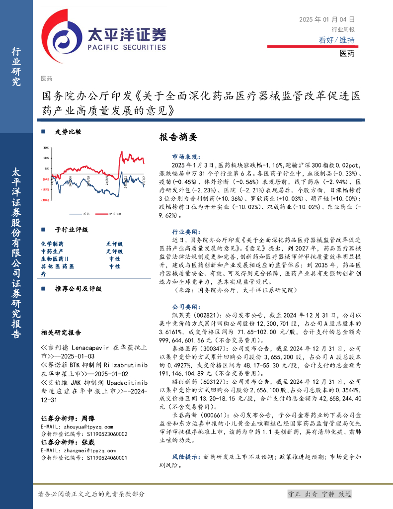 太平洋证券:医药行业周报:国务院办公厅印发《关于全面深化药品医疗器械监管改革促进医药产业高质量发展的意见》.pdf