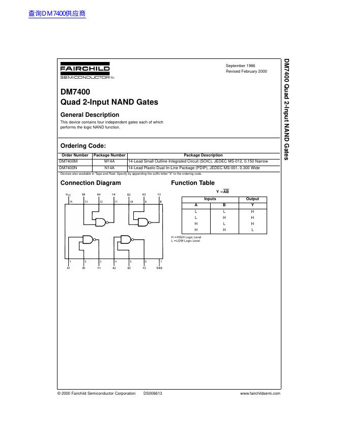 FAIRCHILD semiconductor DM7400 Quad 2-Input NOR Gates 数据手册.pdf