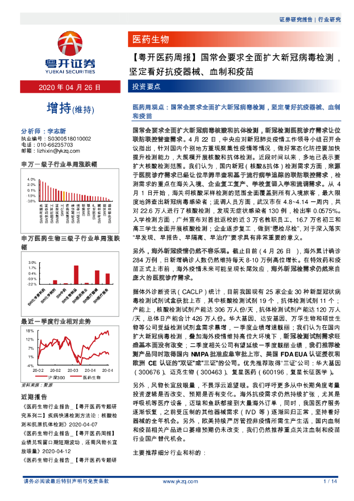 粤开证券:【粤开医药周报】国常会要求全面扩大新冠病毒检测,坚定看好抗疫器械、血制和疫苗.pdf
