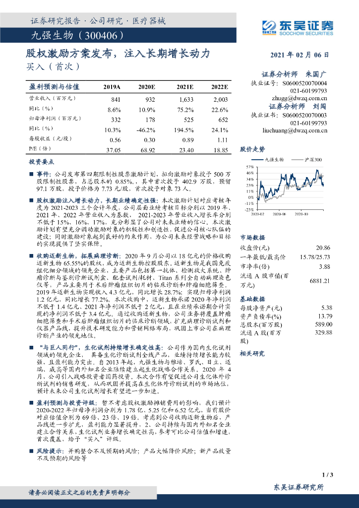 东吴证券:九强生物(300406)-股权激励方案发布,注入长期增长动力.pdf