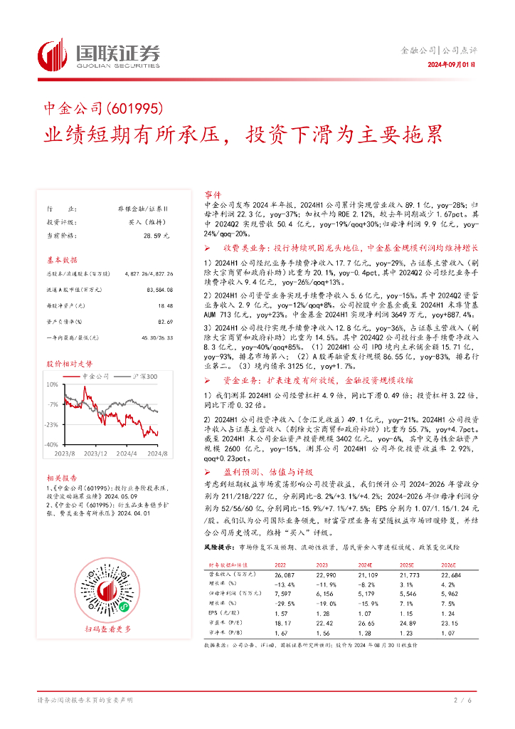 国联证券:中金公司(601995)-业绩短期有所承压,投资下滑为主要拖累.pdf