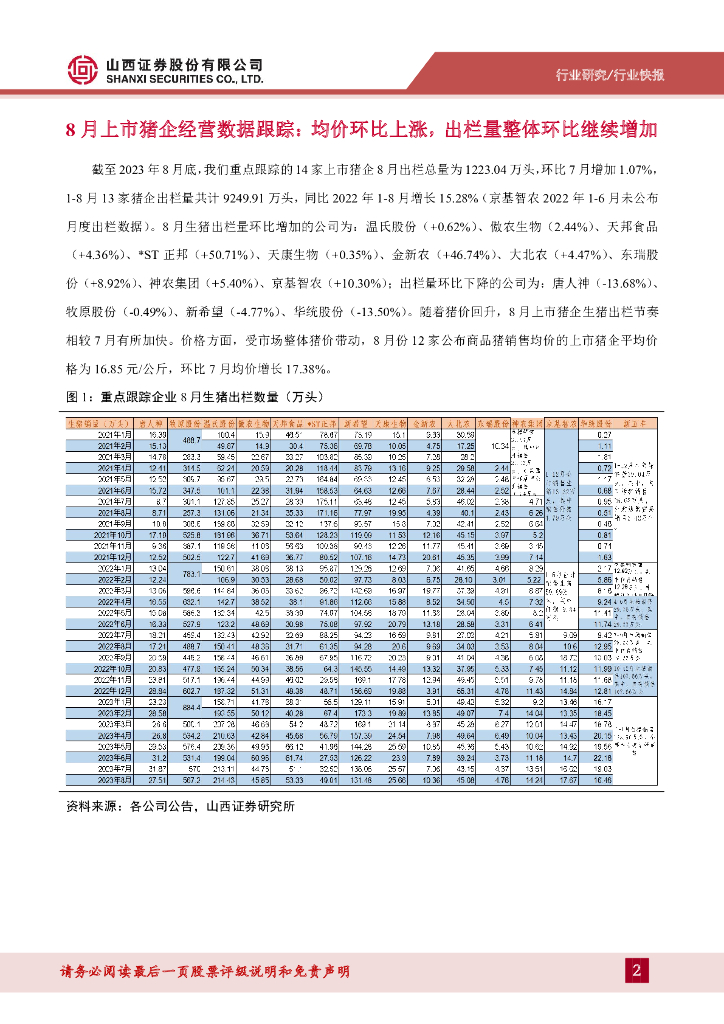 山西证券:农林牧渔8月上市猪企经营数据跟踪:均价环比上涨,出栏量环比继续增加.pdf