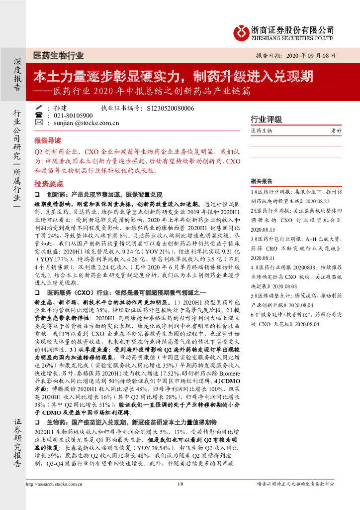 浙商证券:医药行业2020年中报总结之创新药品产业链篇:本土力量逐步彰显硬实力,制药升级进入兑现期.pdf