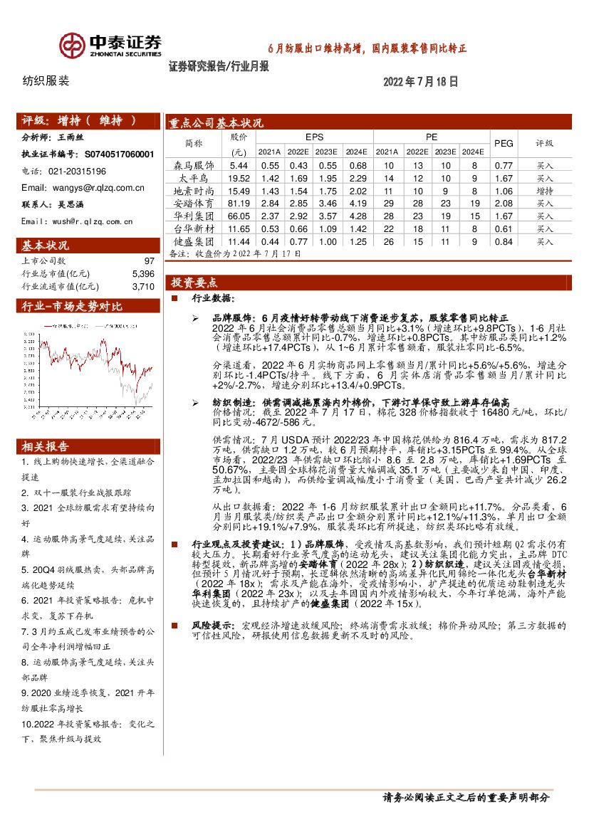 中泰证券:纺织服装行业月报:6月纺服出口维持高增,国内服装零售同比转正.pdf
