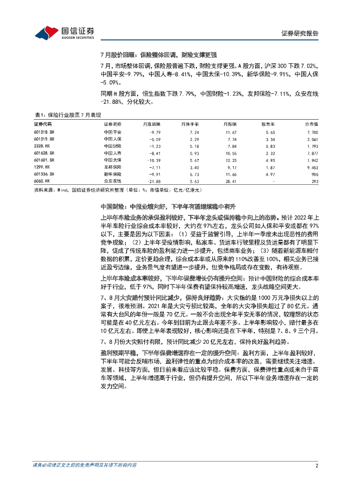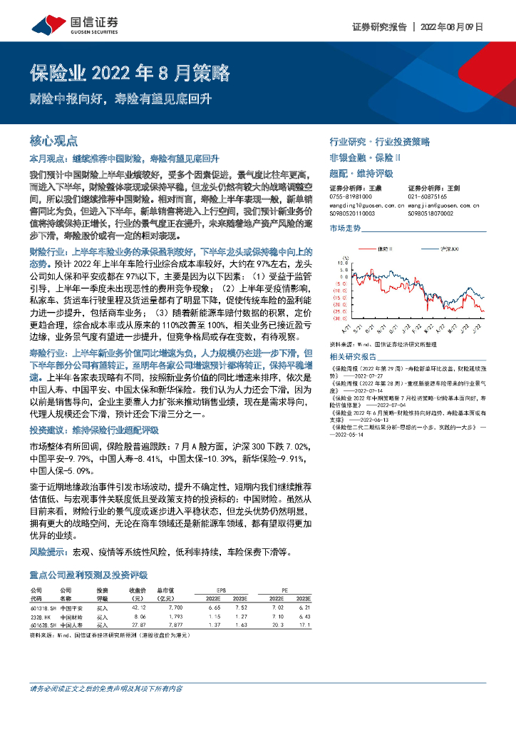 国信证券:保险业2022年8月策略:财险中报向好,寿险有望见底回升.pdf