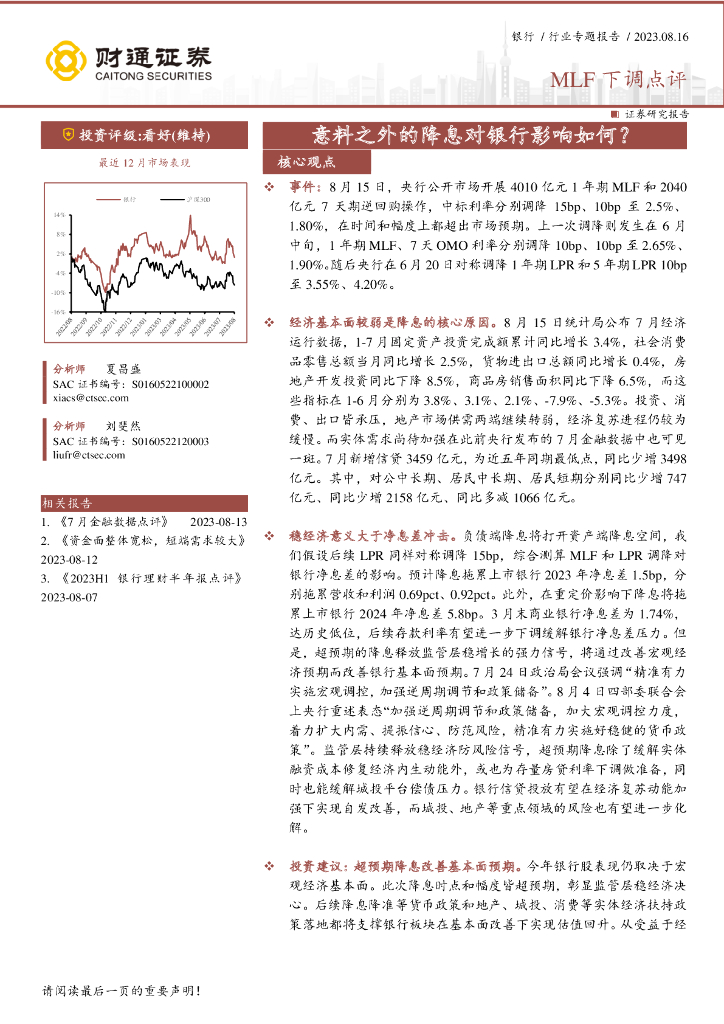 财通证券:银行行业专题报告:MLF下调点评-意料之外的降息对银行影响如何?.pdf