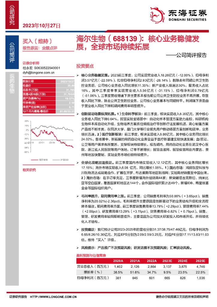 东海证券:海尔生物(688139)-公司简评报告:核心业务稳健发展,全球市场持续拓展.pdf