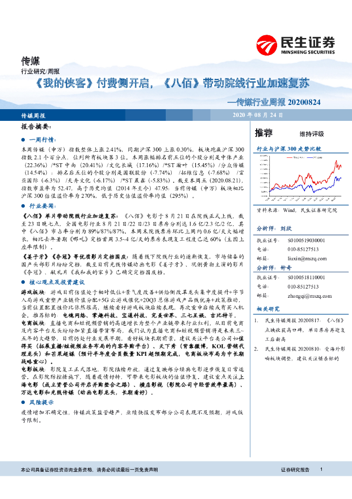 民生证券:传媒行业周报:《我的侠客》付费侧开启,《八佰》带动院线行业加速复苏.pdf