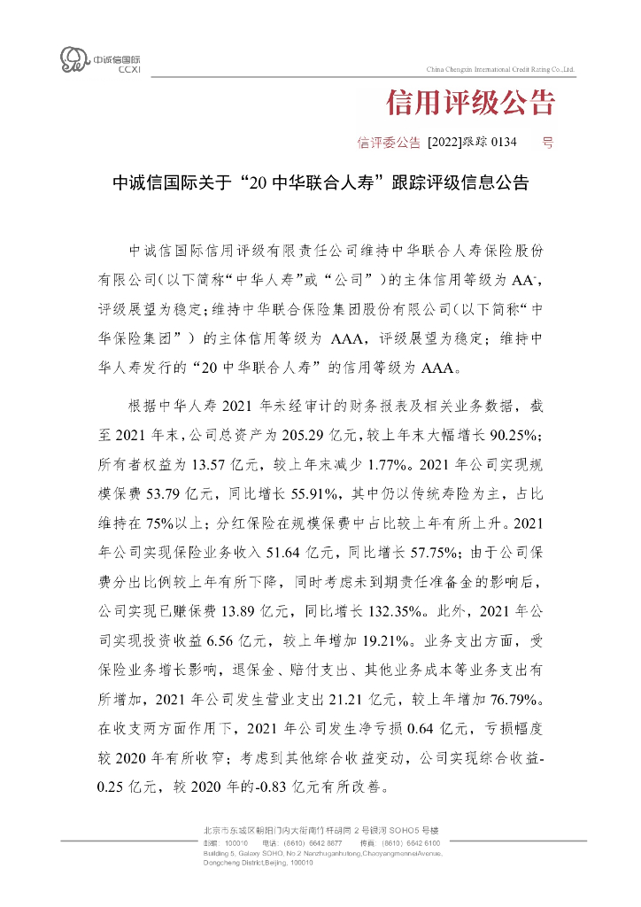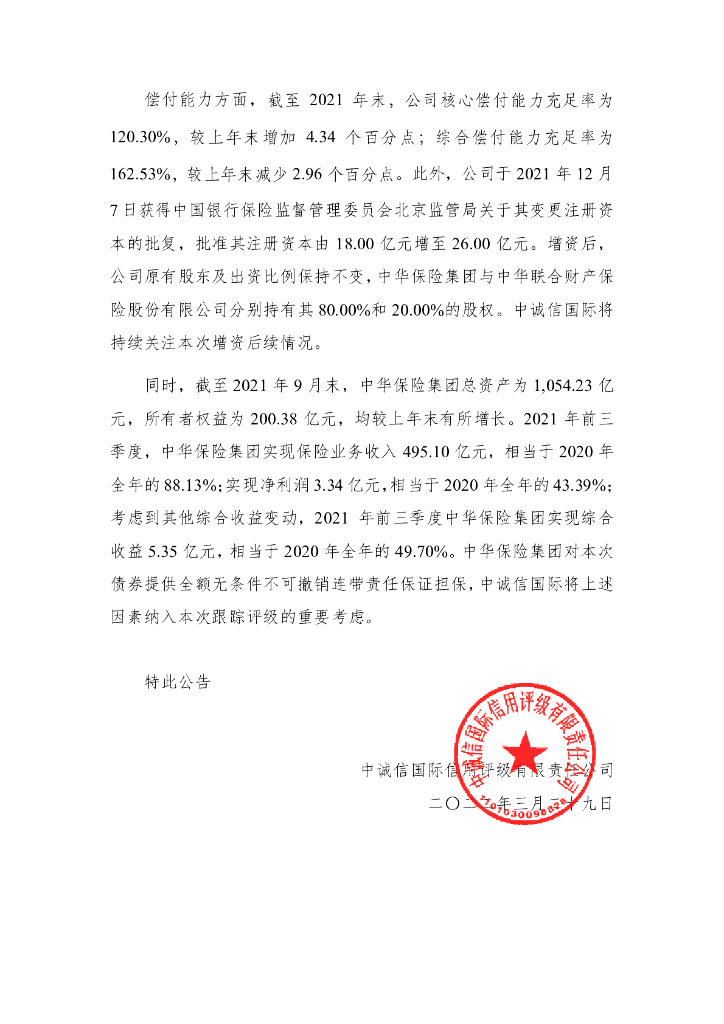 中诚信:中诚信国际关于“20中华联合人寿”跟踪评级信息公告.pdf