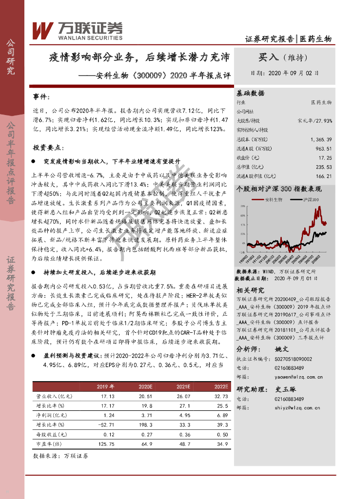万联证券:安科生物(300009)-2020半年报点评:疫情影响部分业务,后续增长潜力充沛.pdf