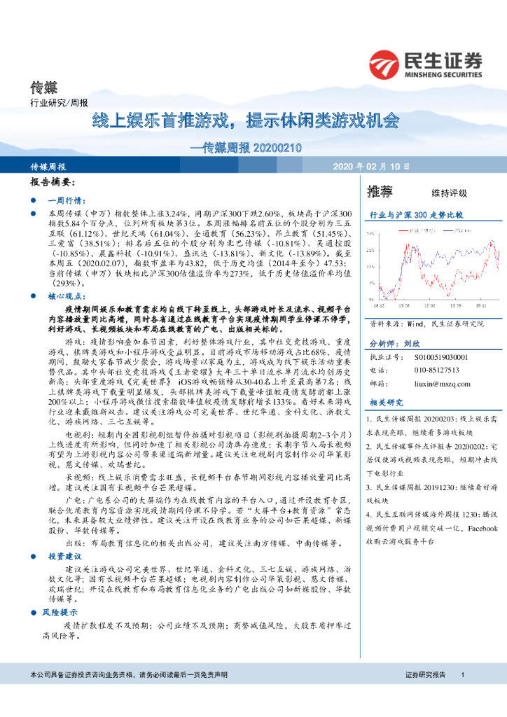 民生证券:传媒周报:线上娱乐首推游戏,提示休闲类游戏机会.pdf