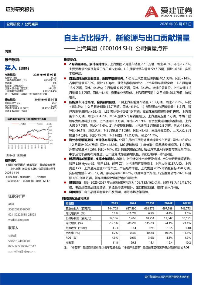 爱建证券:上汽集团(600104)-公司销量点评:自主占比提升,新能源与出口贡献增量.pdf